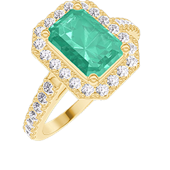 Ring Yellow gold 18 carats - Emerald Baguette 1 Carats - Halo Diamond white - Setting Diamond white