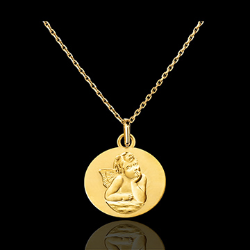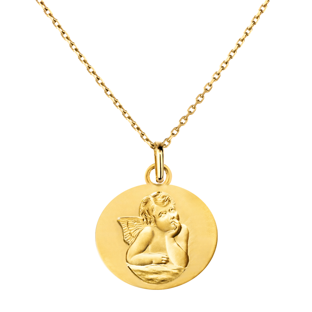This round medal in 9K yellow gold features the Angel Raphael, a symbol of protection and guidance. Its classic and refined design offers timeless elegance.