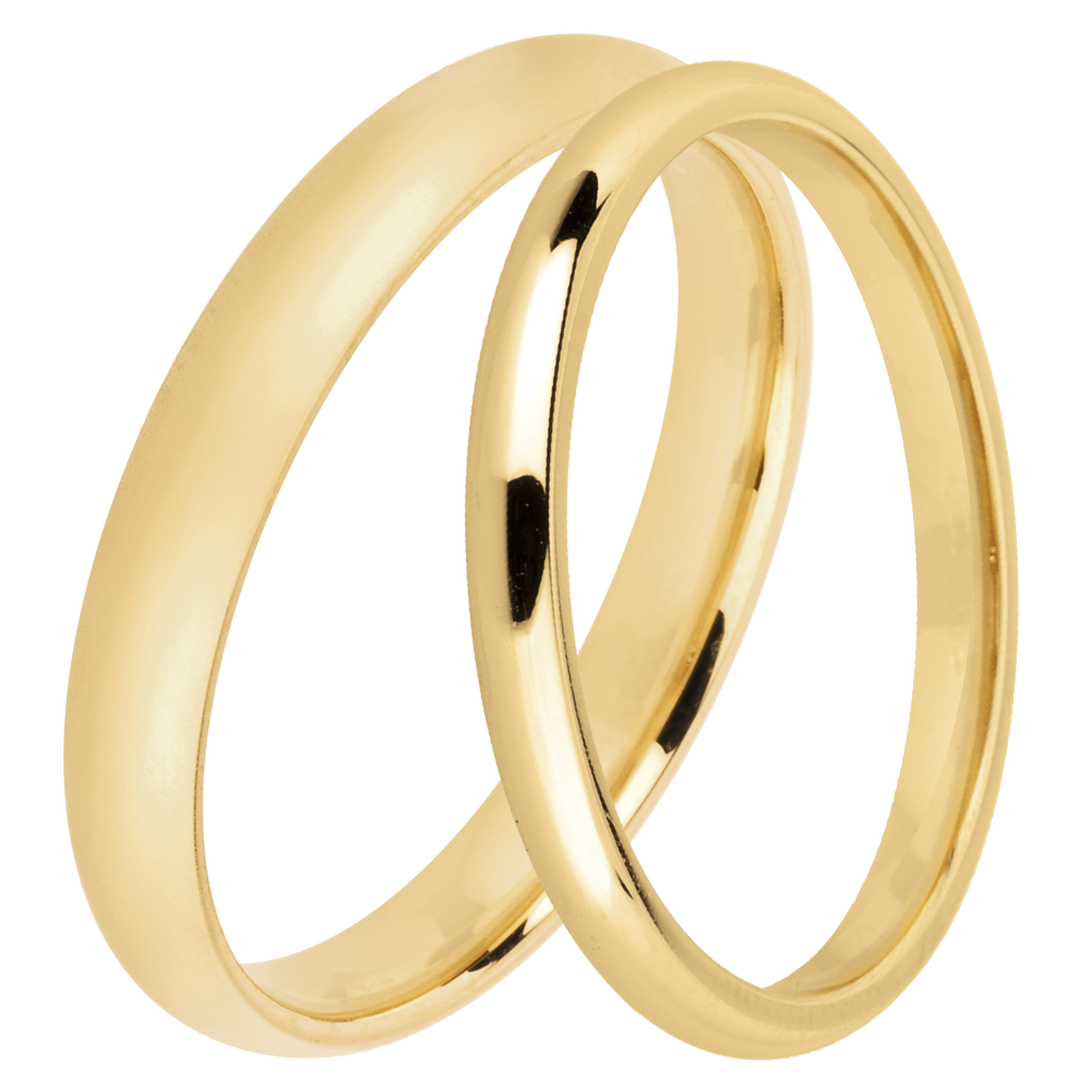 An elegant pair of classic yellow gold wedding bands: 2mm width for her, 3mm width for him.…