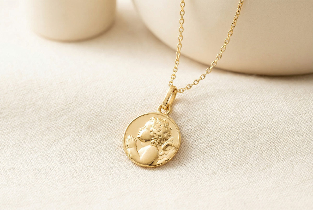 Featuring a praying angel, symbolising purity and protection, this medal embodies faith and serenity.