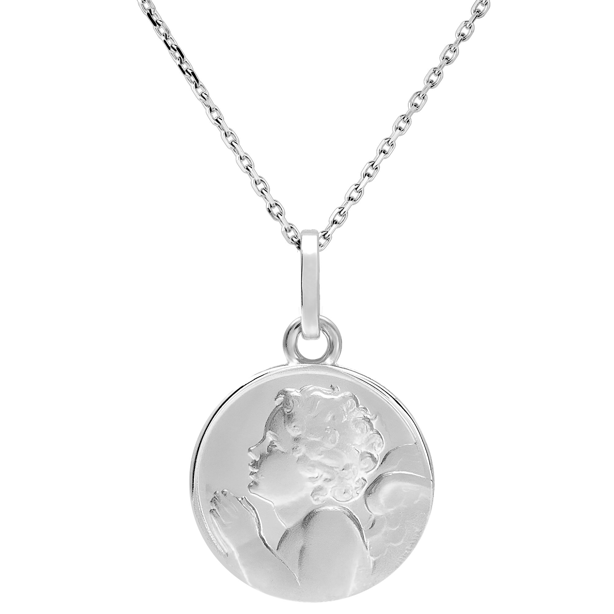 Featuring a praying angel, a symbol of purity and protection, this medal embodies faith and serenity. - Material: 9-carat white gold - Diameter: 14 mm - Finish: Sandblasted gold relief - Customizable engraving on the back Delivered in an elegant box, ready to give. Chain not included. White gold (9 carats = 375/1000): 1 g. Without chain. White gold (9K Gold = 375/-): 1 g. More dimensions
