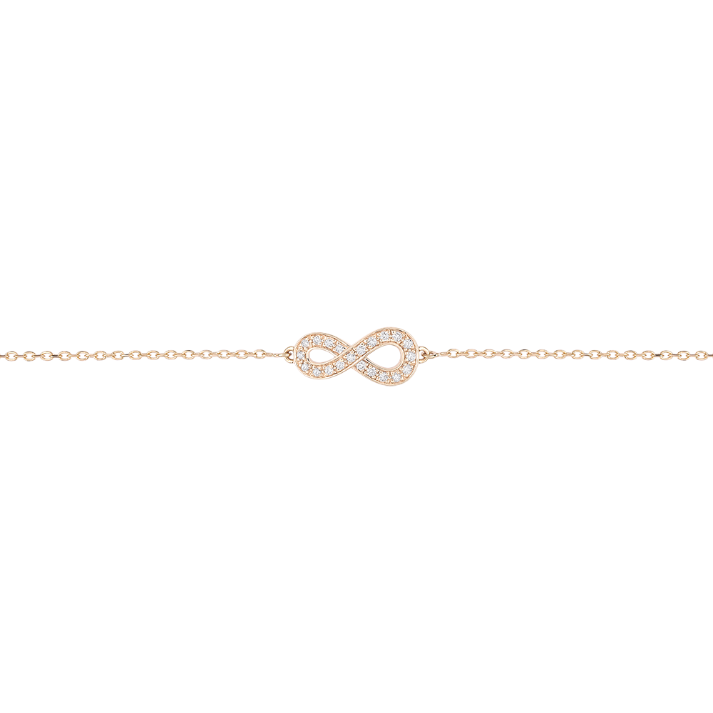 An infinity sign in pink gold set with diamonds mounted on a bracelet. It is the symbol of absolute eternity. Bracelet adjustable in length: 18cm, 17cm, 16cm. Pattern 15mm in length and 7mm in height. 21 diamonds : 0.11 carat - Pink gold (18K Gold = 750/-): 1.1 g. More dimensions