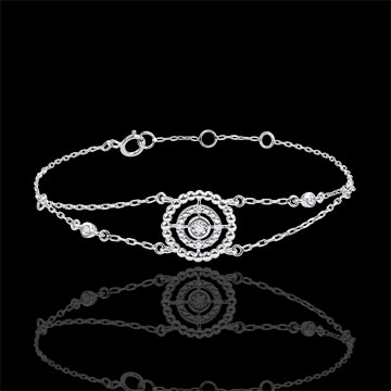 A circle of gold beads around a circle of diamonds and a solitaire in the center. This jewel is mounted on a chain set with two diamonds. Bracelet with adjustable length: 18cm, 17cm, 16cm. Pattern 11 mm in length and 11 mm in height.