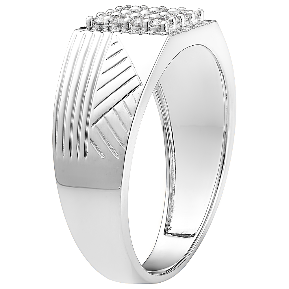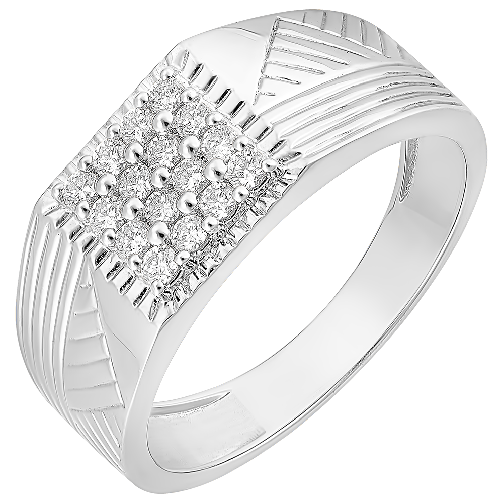 A white gold base signet ring finely engraved and generously paved with 16 diamonds on its center.