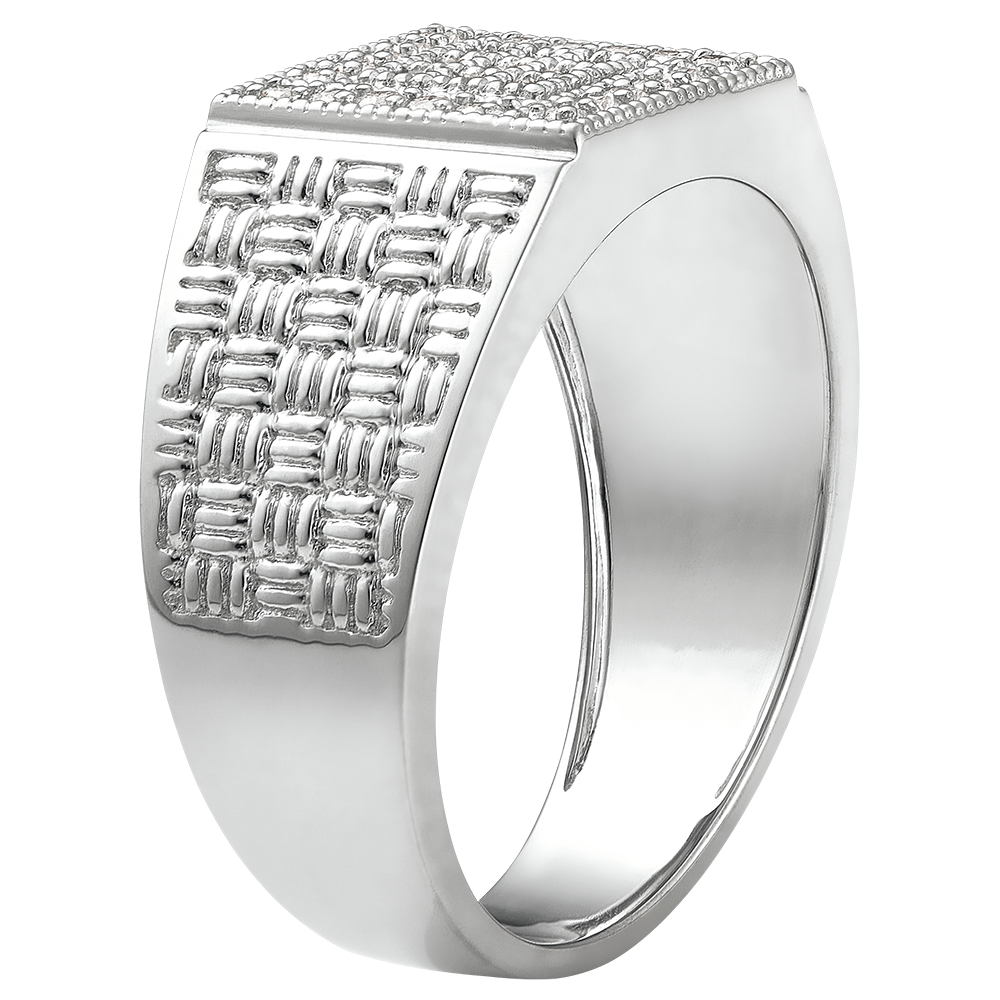 A woven white gold signet ring with a square base generously paved with 29 diamonds. A delicate yet impressive jewel.