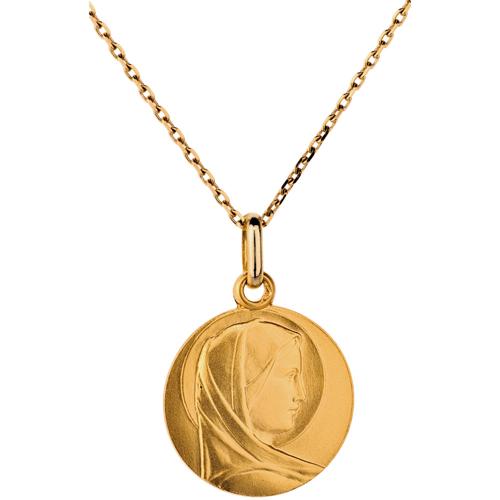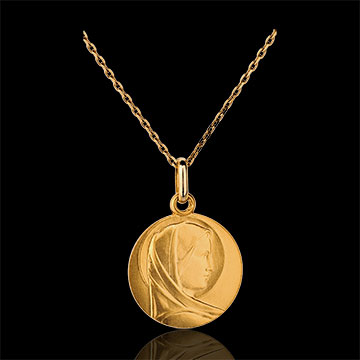 The Blessed Virgin, pure and elegant, wearing a veil and halo. A classic Blessed Virgin baptism medal.