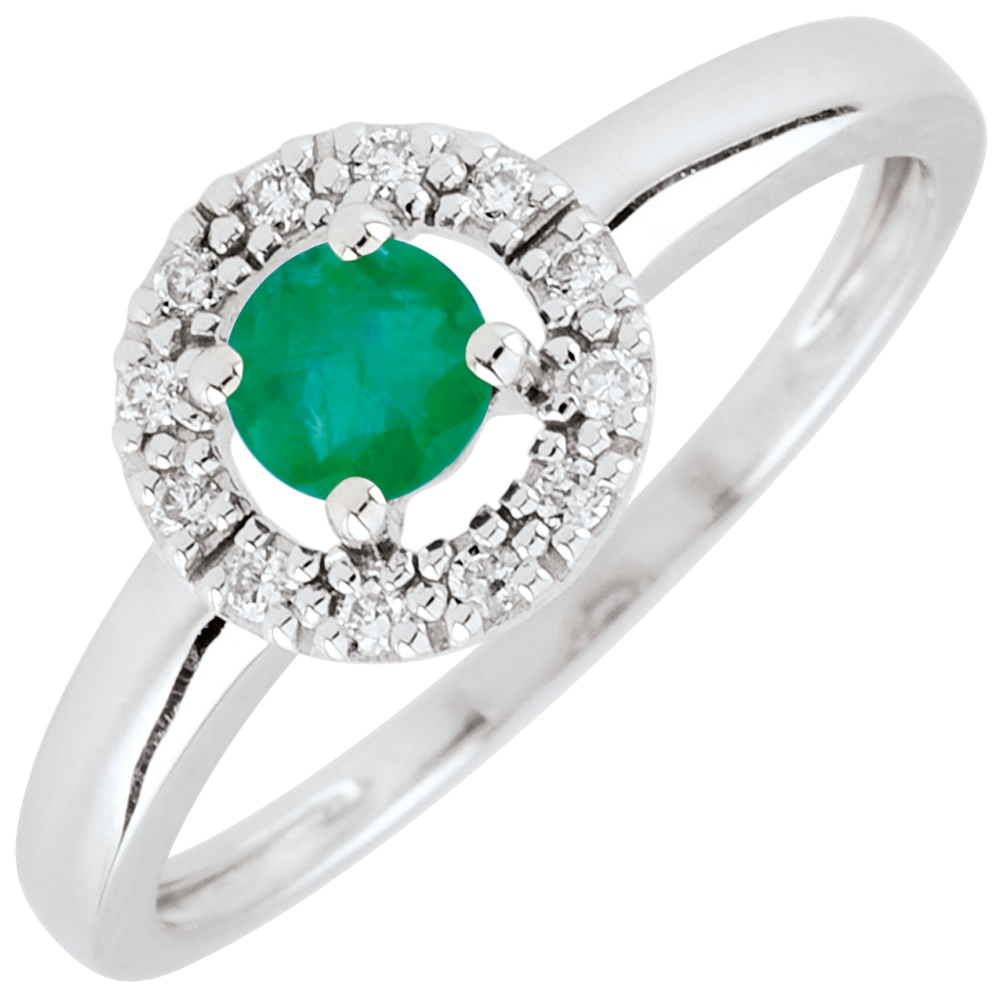 A white gold diamond-encrusted circle protects an emerald like a nest.