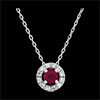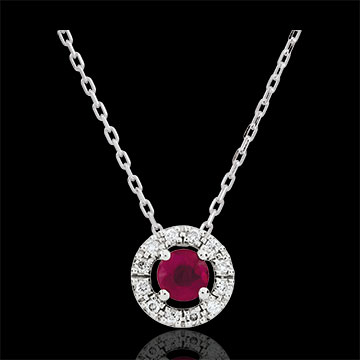 A white gold diamond-encrusted circle protects a ruby like a nest. With gold chain 375/- . 12 diamonds : 0.07 carat - White gold (9K Gold = 375/-): 1.7 g. Ruby : 1 - Total: 0.37 carat More dimensions