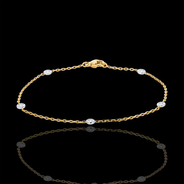 A new constellation is born when a fine gold chain joins these diamonds together 18cm.5 diamonds : 0.07 carat - White and Yellow Gold (18K Gold = 750/-): 1.55 g. 5 diamonds : 0.07 carat - White and Yellow Gold (18K Gold = 750/-): 1.4 g. More dimensions