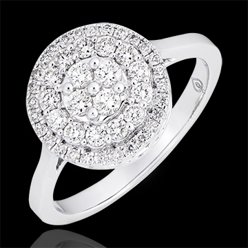 A worked mount that elevates a concentric diamond pavement, and which takes the form of a romantic jewelry. A sparkling halo for a noble and elegant ring. 45 diamonds : 0.5 carat - White gold (9K Gold = 375/-): 3.2 g. Cluster of natural diamonds : 45 - More dimensions