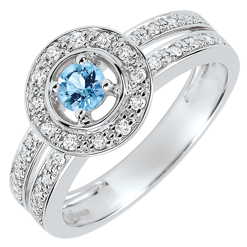 The central topaze is elegantly enhanced in a shrine of brilliant diamonds. A double ring set with diamonds carries it and sublimates perfectly the magnificence of this white-gold engagement ring. 0.2 carat central topaze 32 diamonds : 0.17 carat - White gold (18K Gold = 750/-): 3.8 g. Blue Topaze : 1 - Diamond white : 32 - Total: 0.206 carat More dimensions