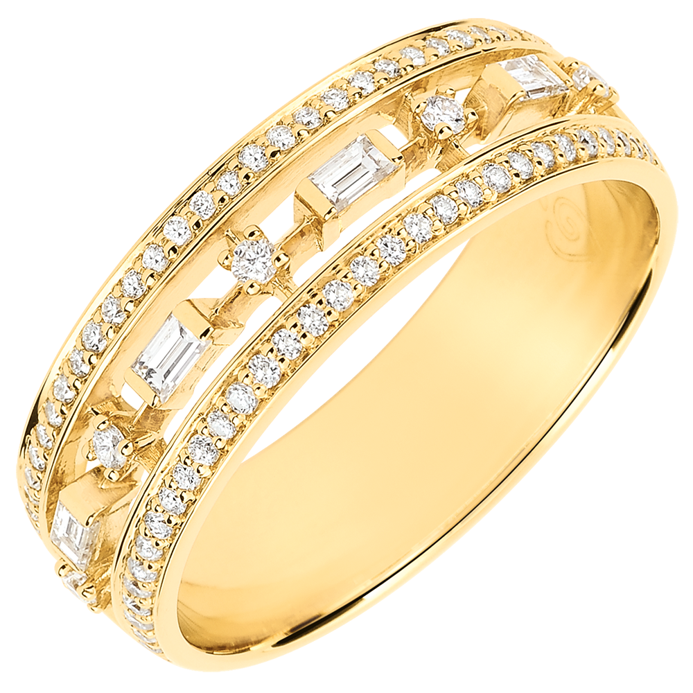 This ring is characterized by elegance and personality and is dazzling due to its unique altenation of blinks and baguette-cut diamonds in yellow gold. 71 diamonds : 0.29 carat - Yellow gold (9K Gold = 375/-): 4.5 g. More dimensions