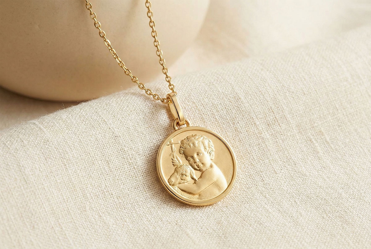 Featuring the Child Jesus holding a lamb, this medal embodies tenderness, faith, and the symbol of the Good Shepherd, protector of innocence.