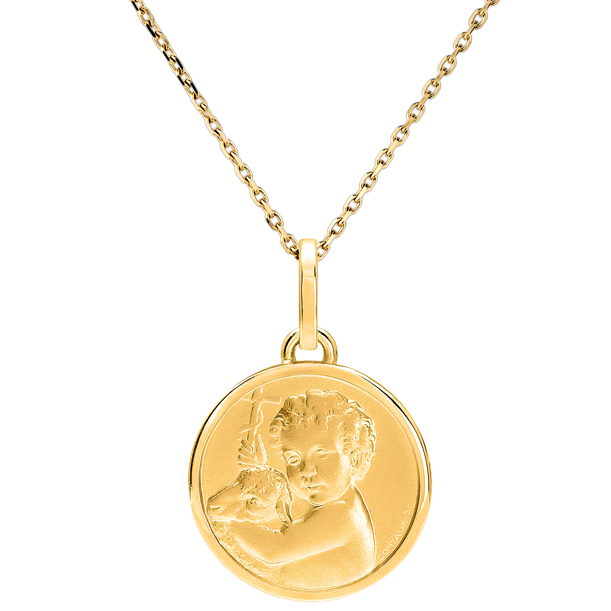 Depicting the Child Jesus holding a lamb, this medal embodies gentleness, faith, and the symbolism of the Good Shepherd, protector of innocence. Material: 9ct Yellow Gold. Diameter: 12 mm. Finish: Sandblasted relief with polished gold border. Customizable engraving on the back. Without chain. Yellow gold (9K Gold = 375/-): 1 g. More dimensions
