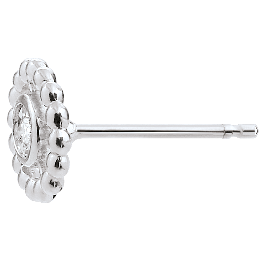 A circle of white gold pearls surrounding a solitaire diamond in the center. 2 diamonds : 0.02 carat - White gold (9K Gold = 375/-): 0.8 g. More dimensions