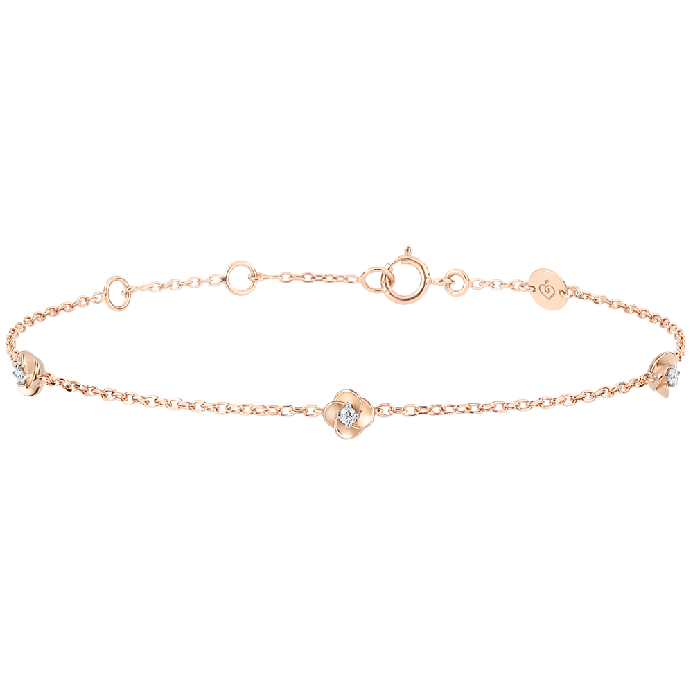 A delicate bracelet of sparkling flowers whose petals open up to show an eternal diamond heart. This bracelet chain is great for casual wear. Bracelet with adjustable length: 17 cm, 16 cm, 14.5 cm. Motif is 4.2 mm long by 4.2 mm high. 3 diamonds : 0.03 carat - Pink gold (18K Gold = 750/-): 1.3 g. More dimensions