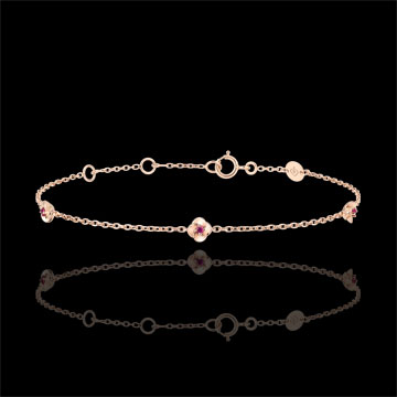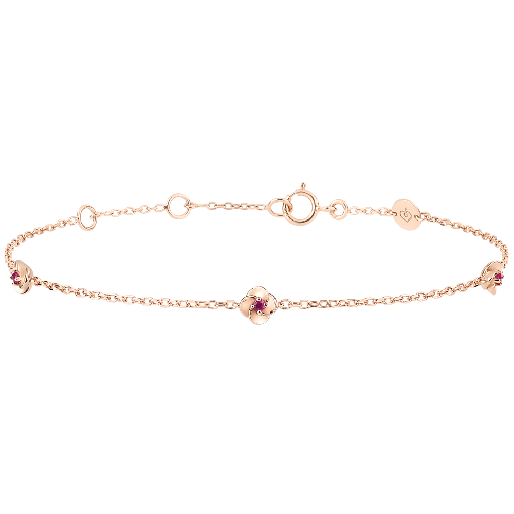 A delicate bracelet of sparkling flowers whose petals open up to show an eternal ruby heart. This bracelet chain is great for casual wear. Bracelet with adjustable length: 17 cm, 16 cm, 14.5 cm. Motif is 4.2 mm long by 4.2 mm high. Pink gold (18K Gold = 750/-): 1.3 g. Ruby : 3 - Total: 0.036 carat More dimensions