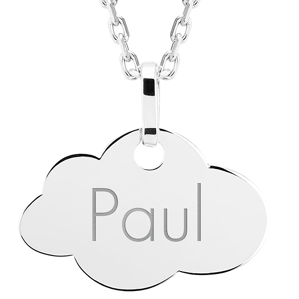 This pendant features a delicate cloud-shaped medal crafted in 9 carat white gold, finely engraved with the Edenly signature.