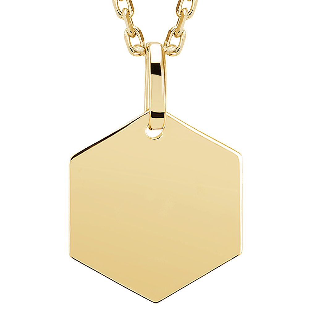 This 18K yellow gold medal pendant offers a refined hexagonal design, perfect for personal engraving from Edenly’s curated selection. Its minimalist shape blends modernity and elegance.
