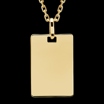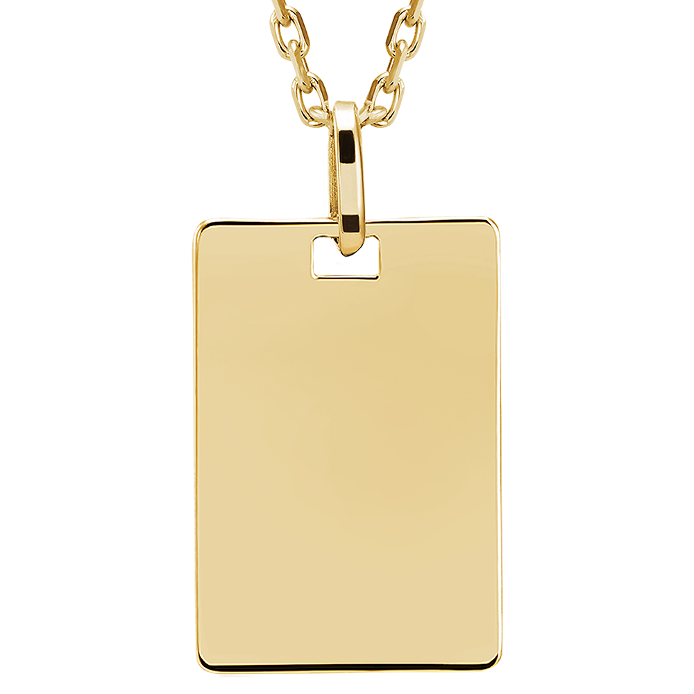 This pendant features a sleek rectangular design crafted in 18 carat yellow gold, offering a refined and timeless look. It is designed to be personalized with an engraving of your choice.