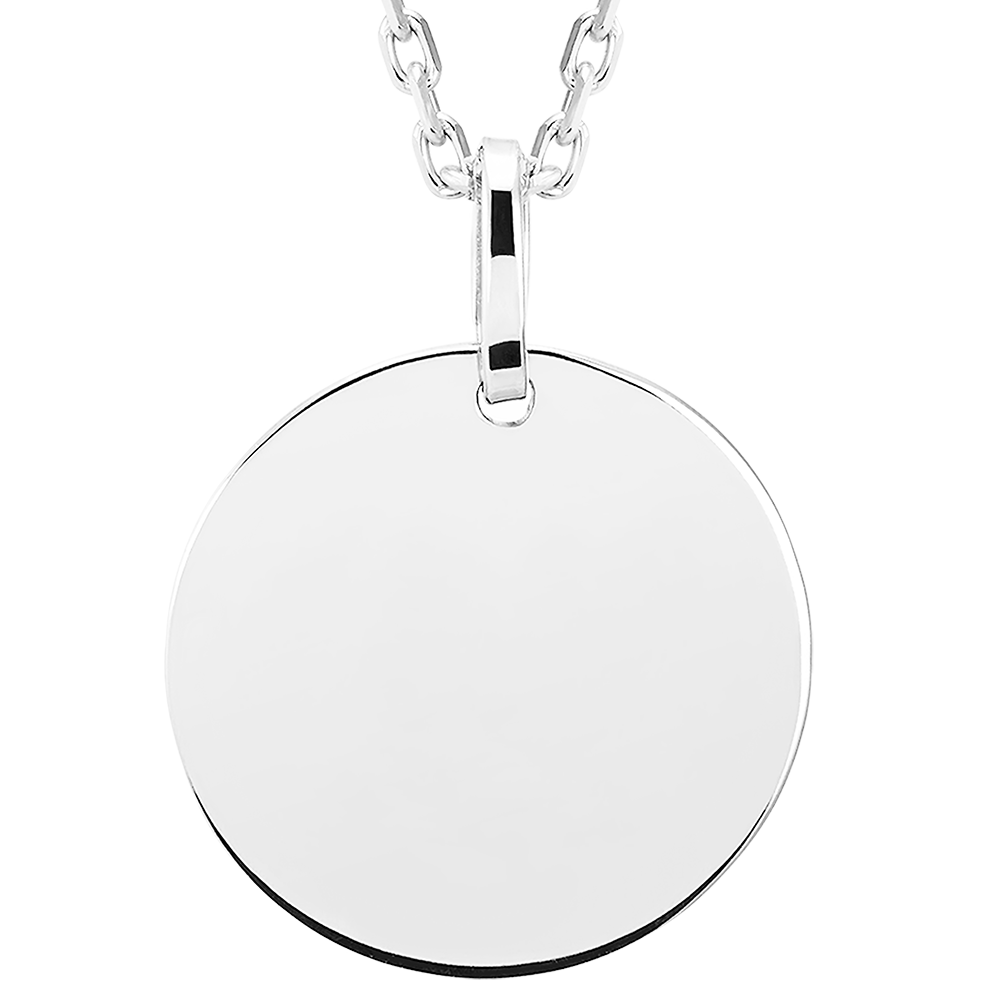This round medal pendant in 9 carat white gold features a refined and minimalist design, perfect for personalisation.