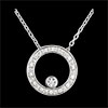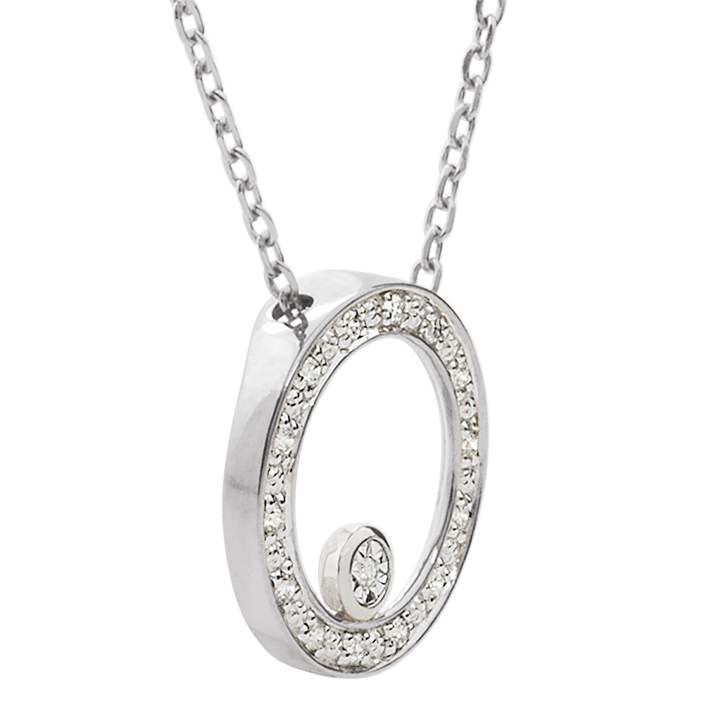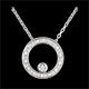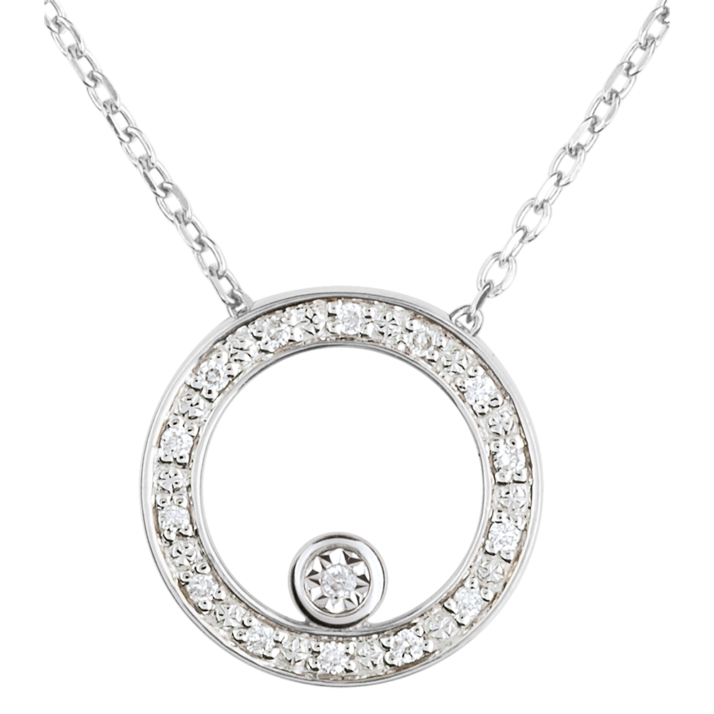 A gold diamond-encrusted circle on which a diamond encircled with white gold is perched hanging from a white gold chain. Timeless and elegant for all occasions. With gold chain 375/- . 15 diamonds : 0.08 carat - White gold (9K Gold = 375/-): 2 g. More dimensions