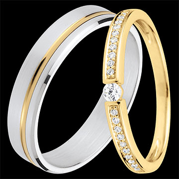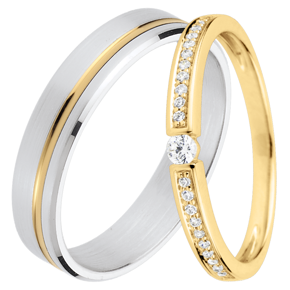 An elegant pair of wedding bands for her & him. For her, a dazzling solitaire diamond is surrounded by a crown of pavé-set diamonds. For him, a white gold band is highlighted by a refined thread of gold.…