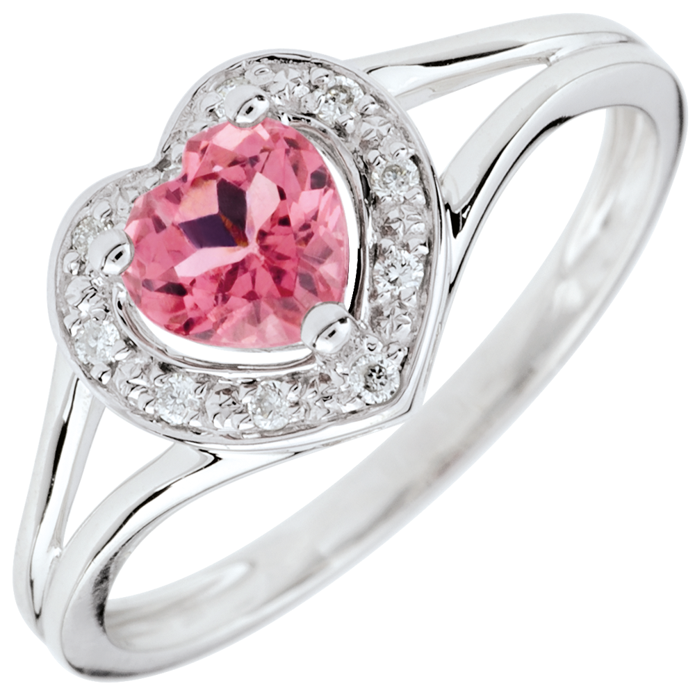 A precious heart in white gold and encrusted with diamonds is the setting for a lavish pink topaz.