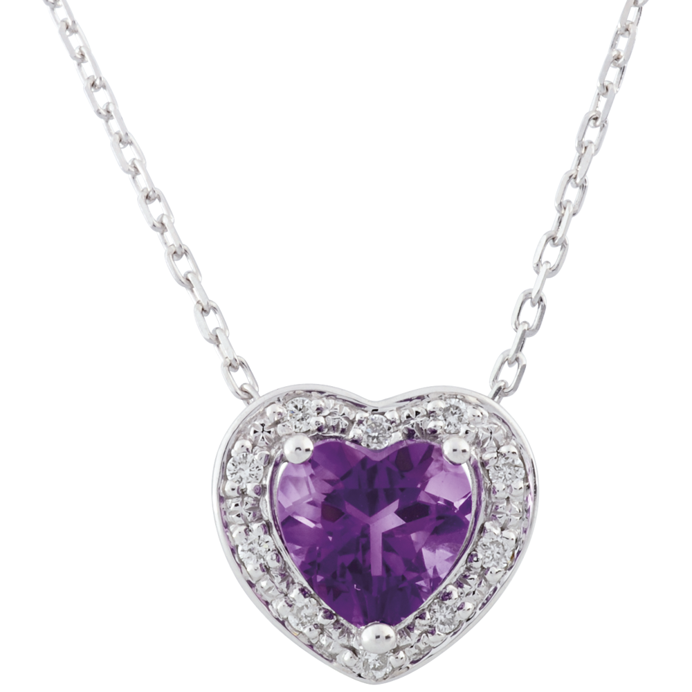 A precious heart in white gold and encrusted with diamonds is the setting for a lavish amethyst..