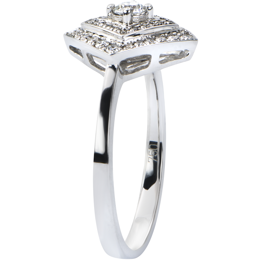 A geometric, majestic ring with an art-déco-design, composed by a central diamond enhanced by a double rhombus-shaped halo paved with diamonds. Certainly a stylish, magnificent ring. 45 diamonds : 0.32 carat - White gold (18K Gold = 750/-): 3.3 g. More dimensions