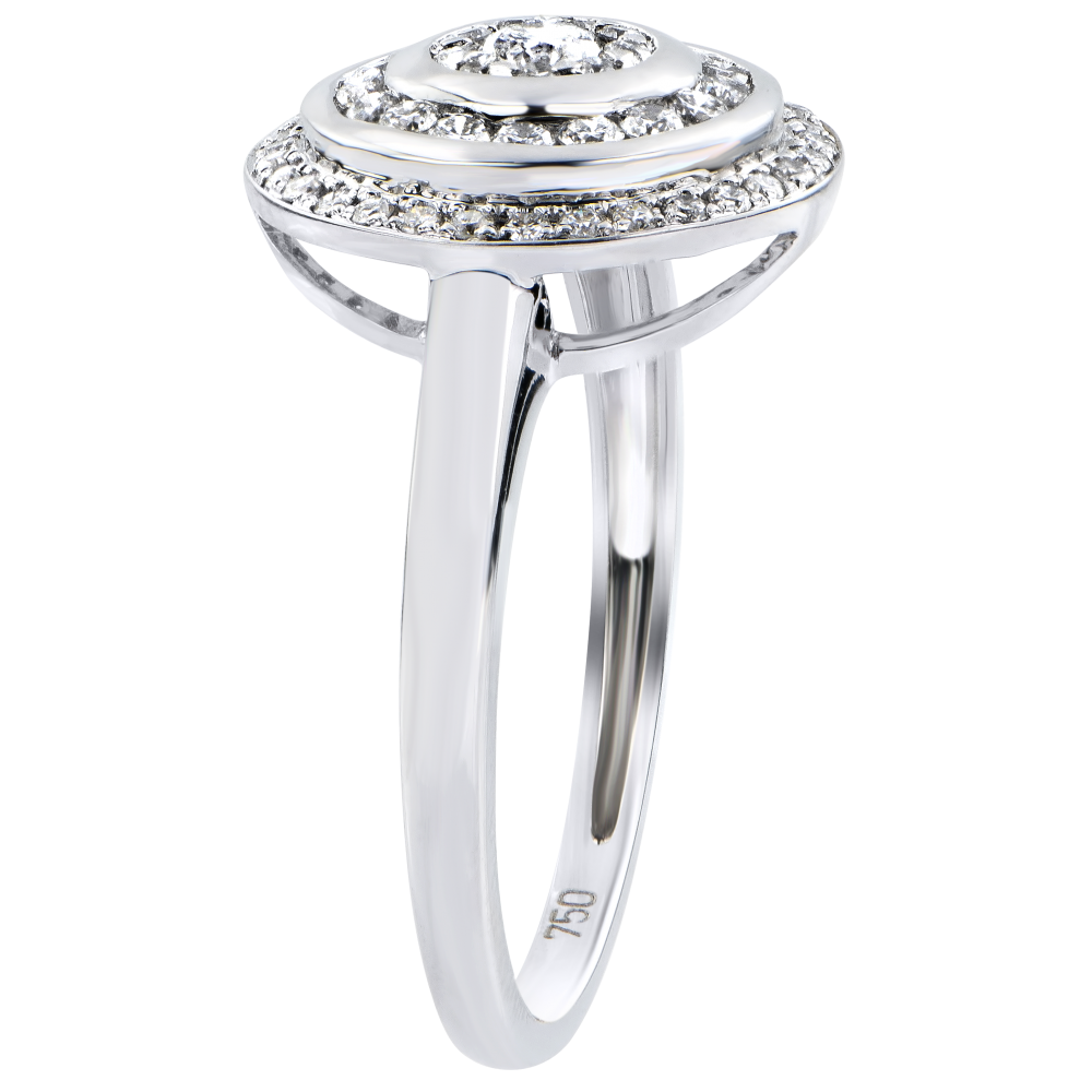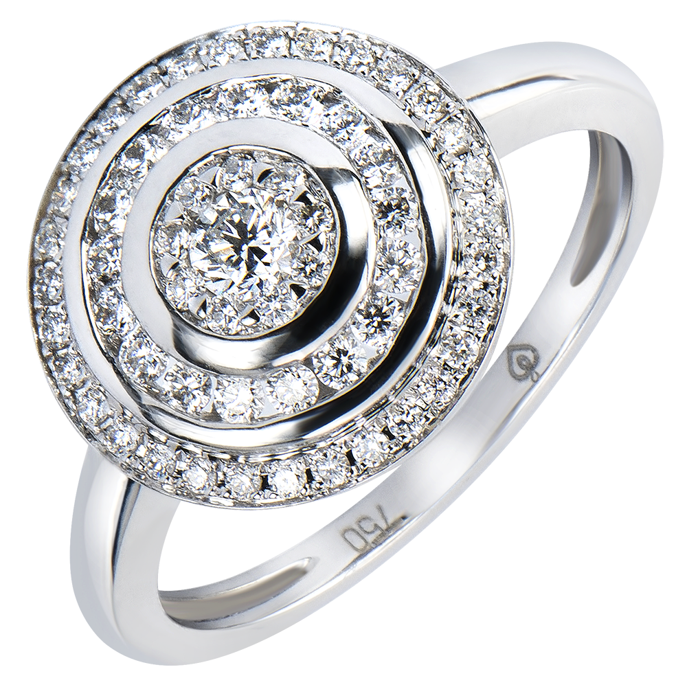 A majestic ring crowned by a diamond, enhancing three diamond halos. A magnificent setting for an hypnotic sparkle. 58 diamonds : 0.42 carat - White gold (9K Gold = 375/-): 2.7 g. Cluster of natural diamonds : 58 - More dimensions