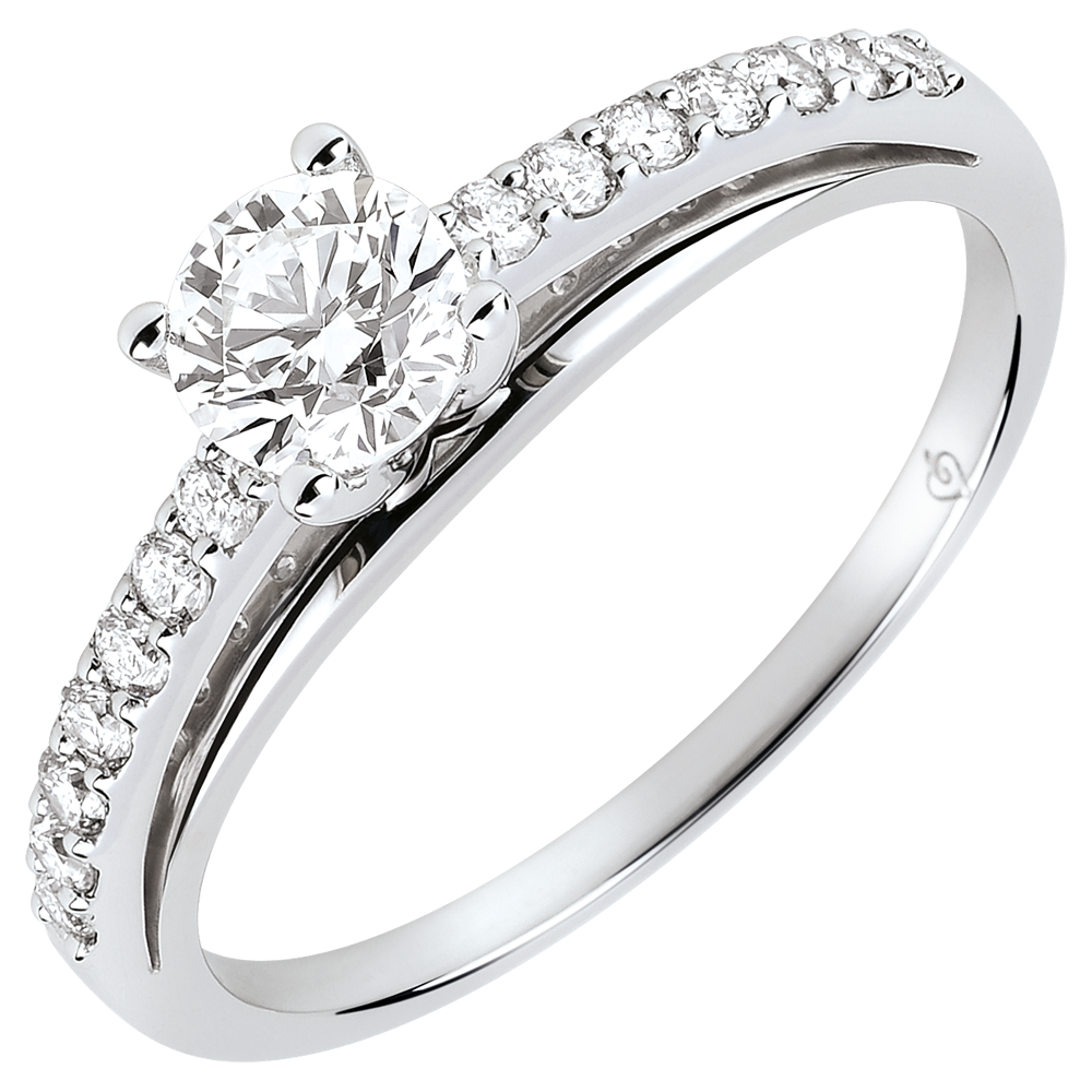 A solitaire diamond is accompanied by round brilliant-cut diamonds for a maximum of brightness on a white gold setting.