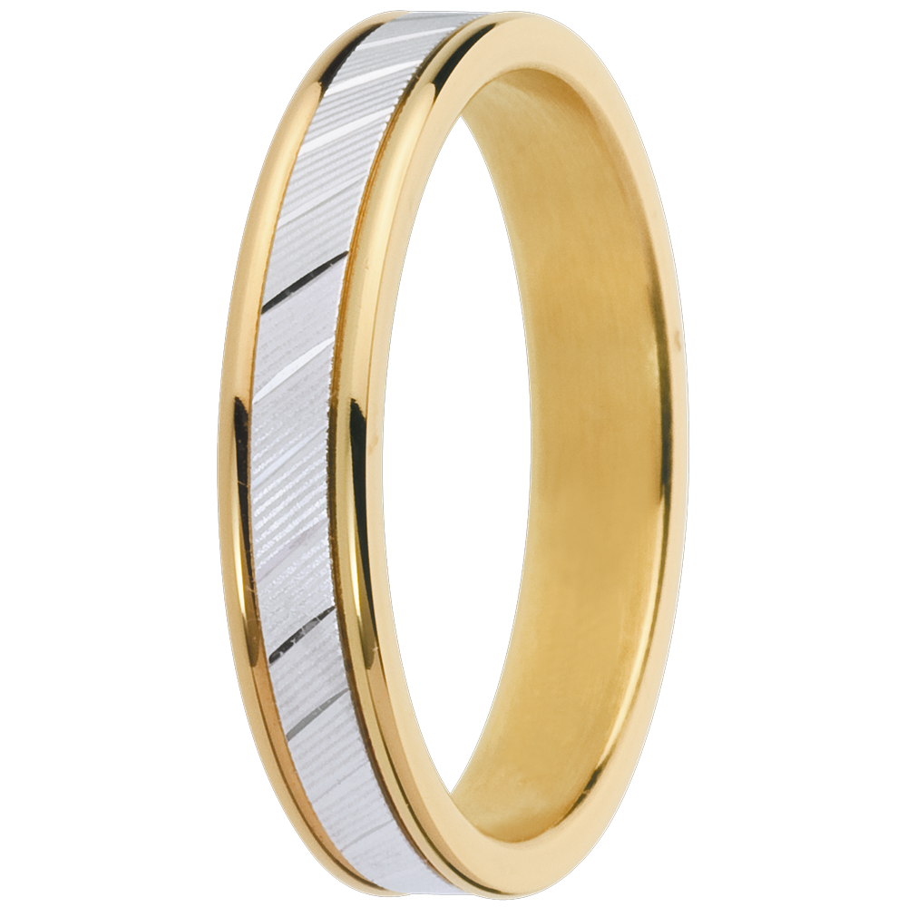 A subtle and original yellow gold wedding ring, emphasised by a central band of engraved white gold.