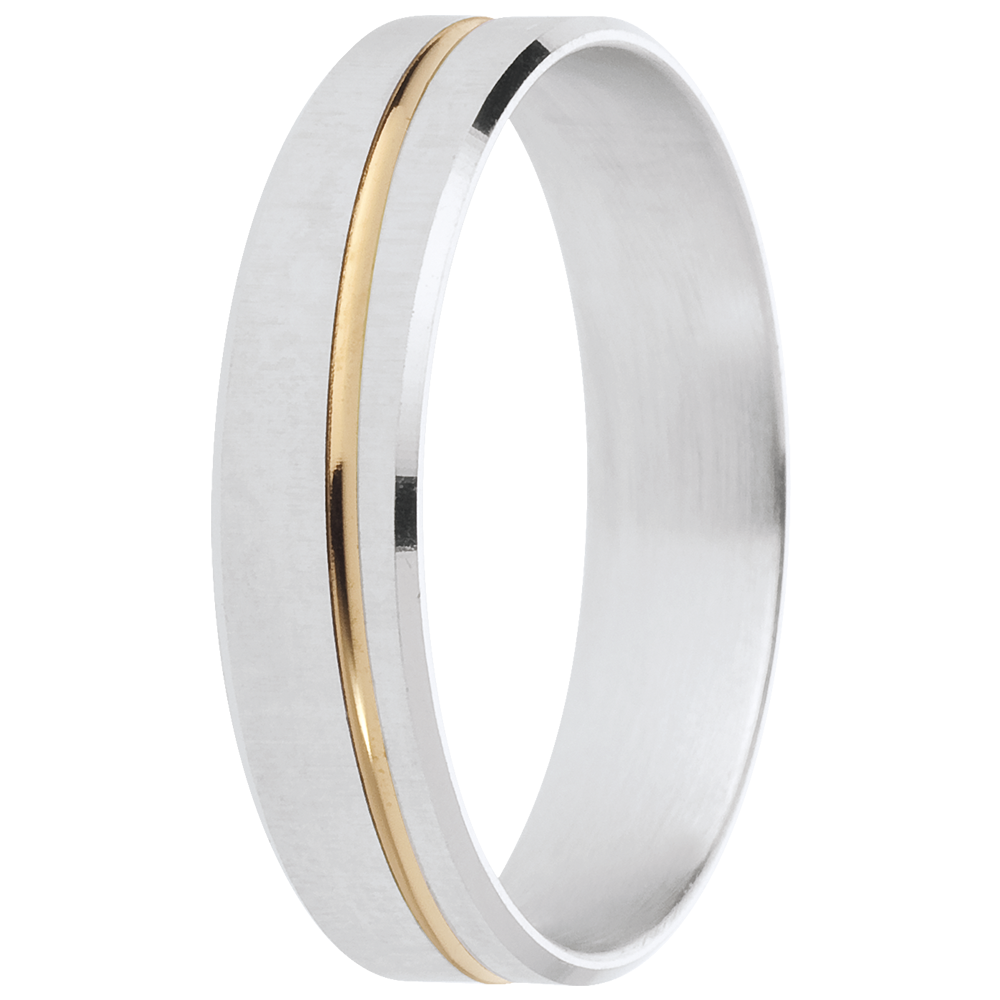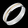 A threated white gold ring is permeated by a strand of yellow gold in an understated union.