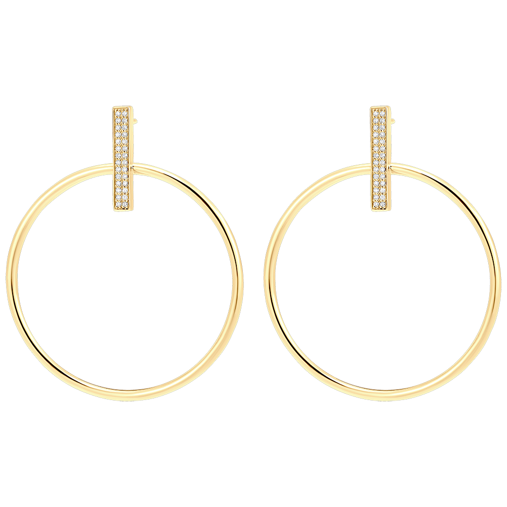 A pair of dangling yellow gold earrings where an elegant diamond-paved bar acts as the anchor point to a circle of pure and delicate gold. A subtle play of suspension and light for discreet sophistication.…