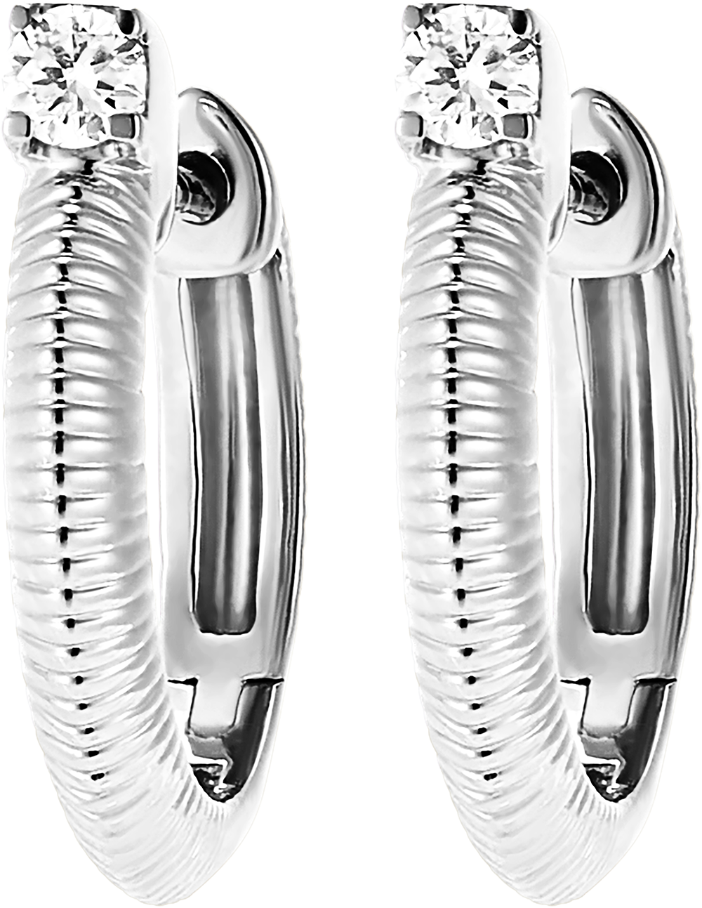 A solitaire diamond held in place by 4 claws and set on a precious, worked gold hoop. An original and timeless pair of earrings.