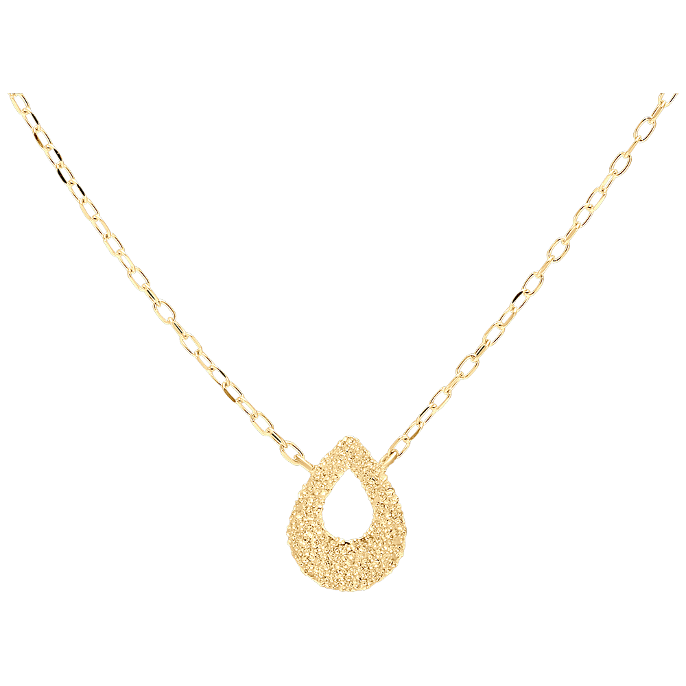 A decidedly modern yellow gold necklace adorned with a textured gold pear motif - diamond effect. Love at first sight guaranteed.