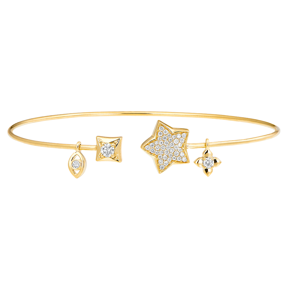 A yellow gold bangle embellished with diamond-studded lucky charms.