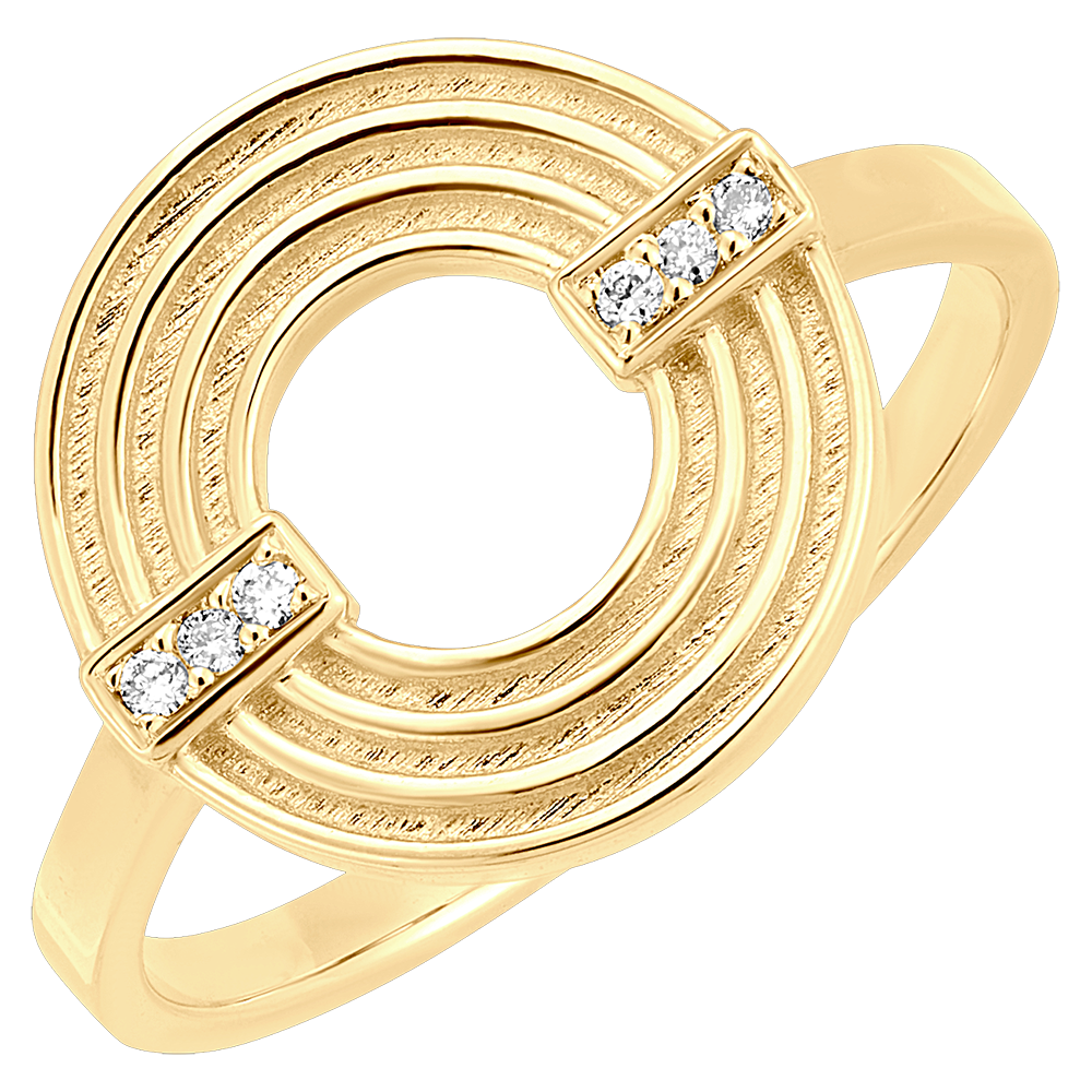 This yellow gold ring captivates with its architectural appearance. Composed of finely engraved concentric circles, it is enhanced by two bars set with bright diamonds. A perfect balance between structured design and brilliance. 6 diamonds : 0.03 carat - Yellow gold (18K Gold = 750/-): 2.6 g. More dimensions