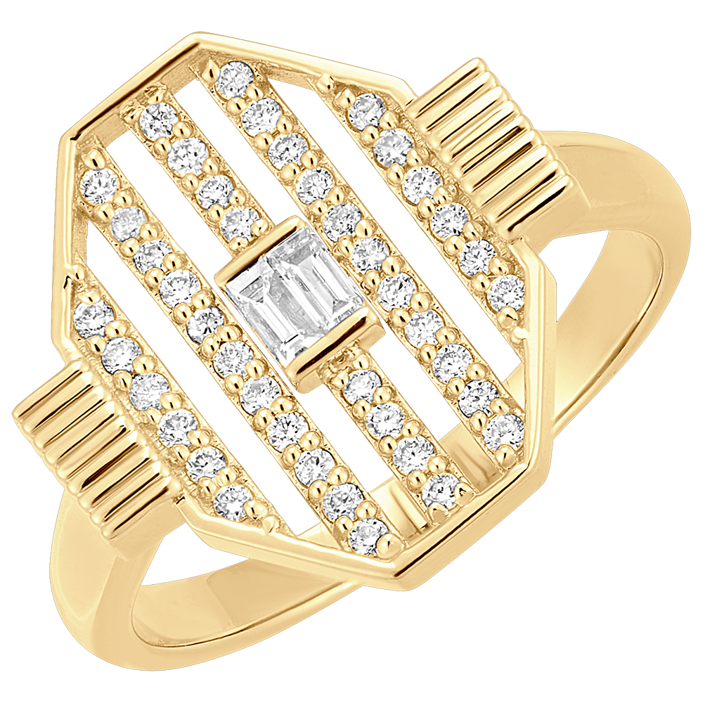 A majestic yellow gold ring with a bold design. Parallel lines set with diamonds and a central brilliance dominated by a heart set with sparkling diamonds. This jewel captures light spectacularly with every movement.