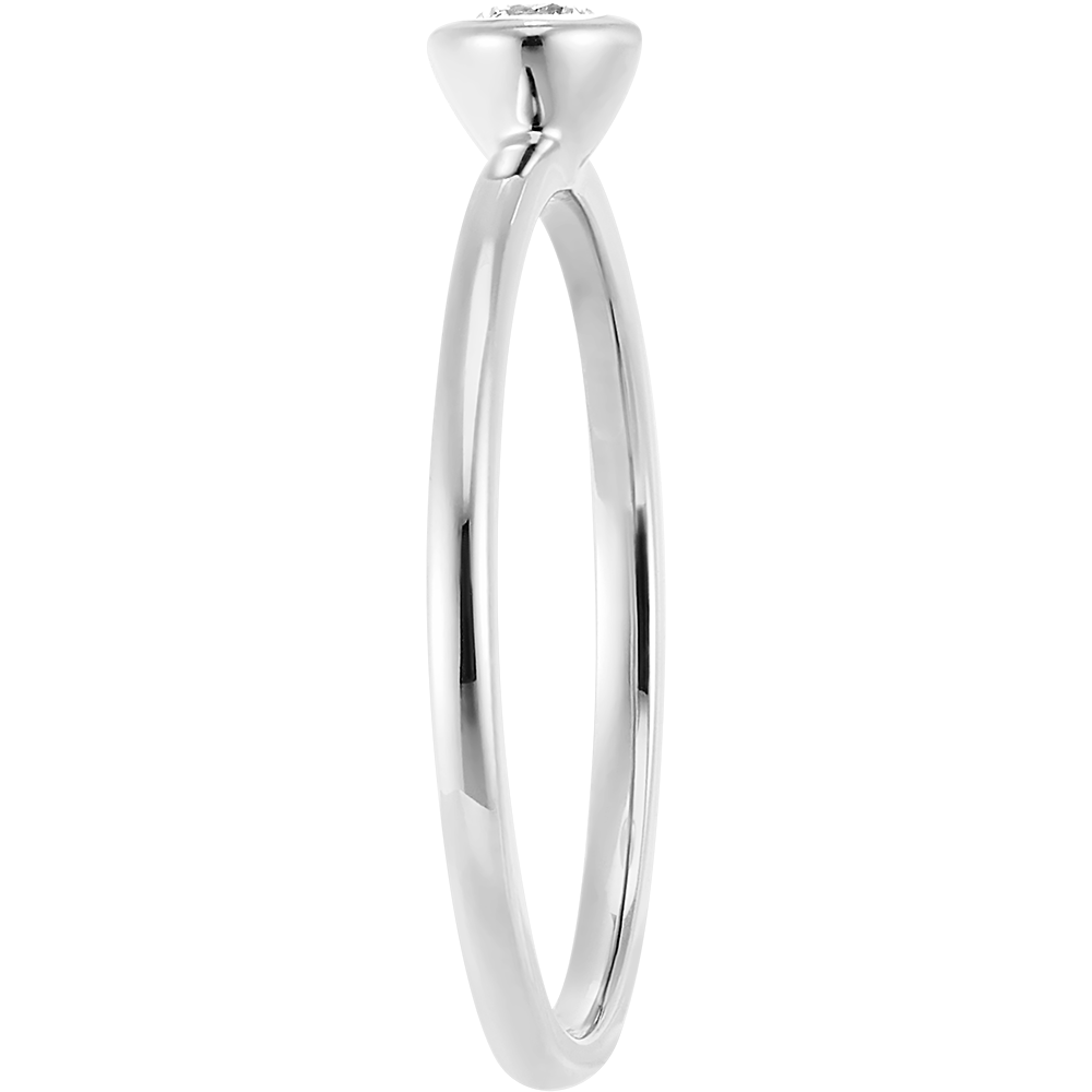 This revisited solitaire ring from the Freshness Collection is crafted in 9 carat white gold, featuring a round diamond of 0.09 carat set in a closed bezel setting. Its minimalist design allows it to be worn alone or paired with other shapes from the collection for a delicate and natural look. A refined creation that embodies purity and lightness, perfect to celebrate an engagement or to offer as a precious gift.… See more Technical information