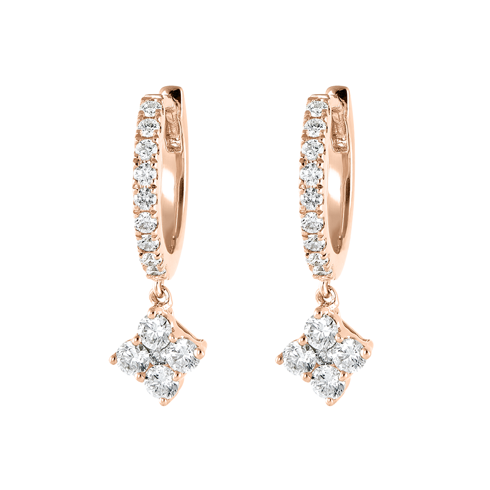 A pair of pink gold semi-paved hoops with a five diamond set charm. A precious and modern touch. Charm : 5.95mm long, 3.20mm wide.