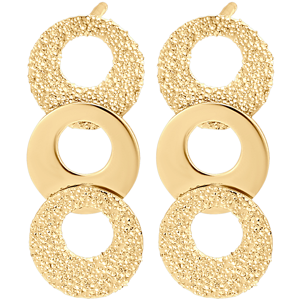 A pair of decidedly modern yellow gold stud earrings. Adorned with a motif of 3 interconnected circles, two in textured gold - diamond effect - and one polished. Love at first sight guaranteed.