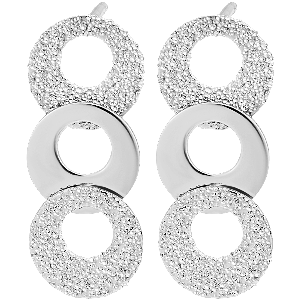 A pair of decidedly modern white gold stud earrings. Adorned with a motif of 3 interconnected circles, two in textured gold - diamond effect - and one polished. Love at first sight guaranteed.