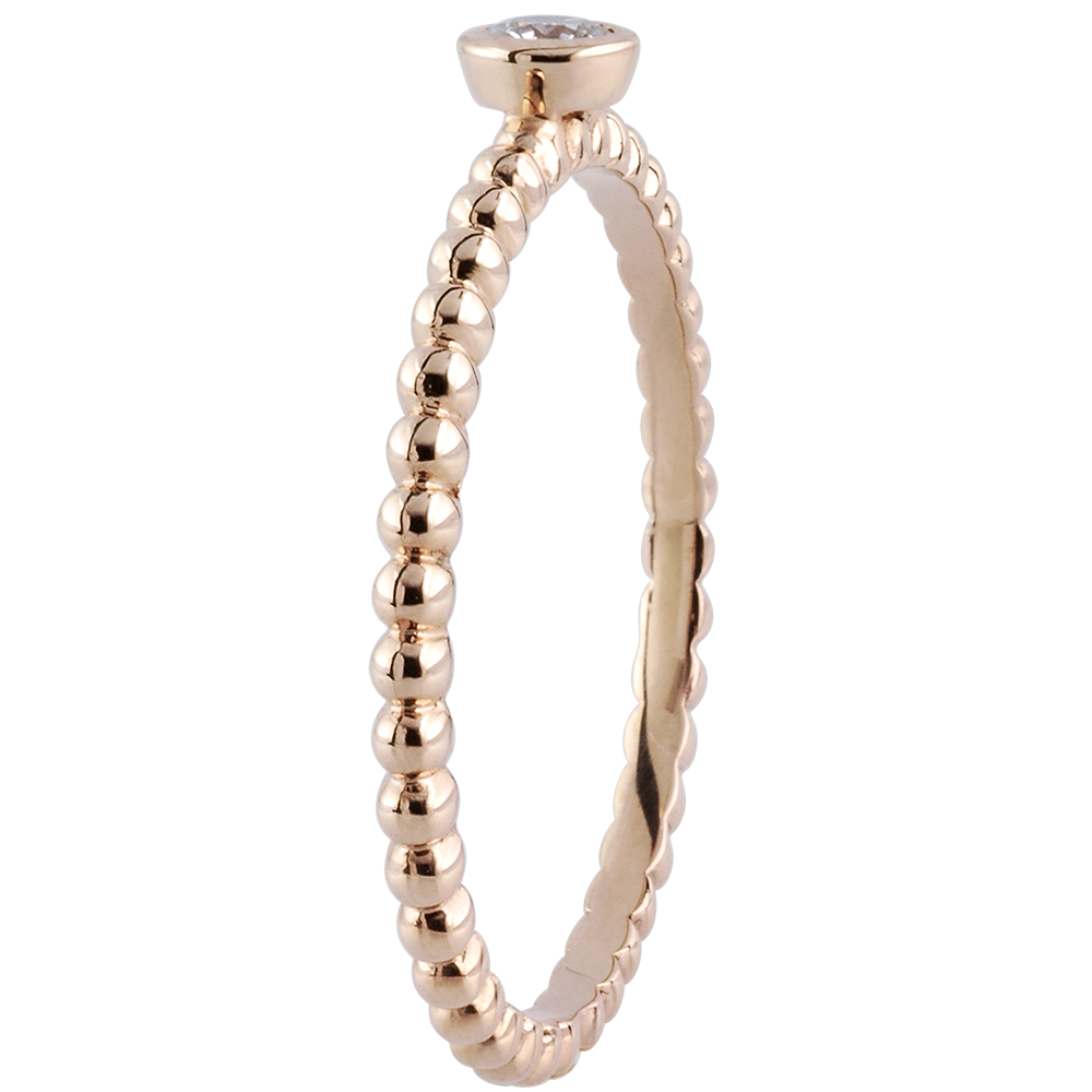 A myriad of gold beads in succession to accompany a solitaire diamond bezel set. A modern and feminine engagement ring