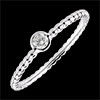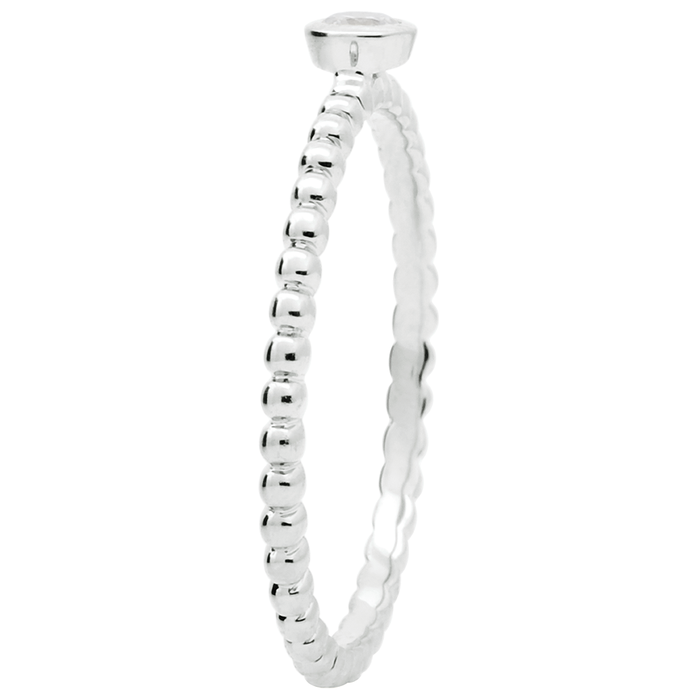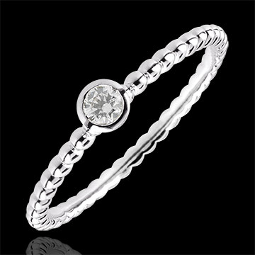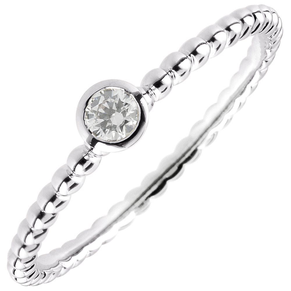 A myriad of gold beads in succession to accompany a solitaire diamond bezel set. A modern and feminine engagement ring 1 diamond : 0.08 carat - White gold (18K Gold = 750/-): 1.3 g. More dimensions