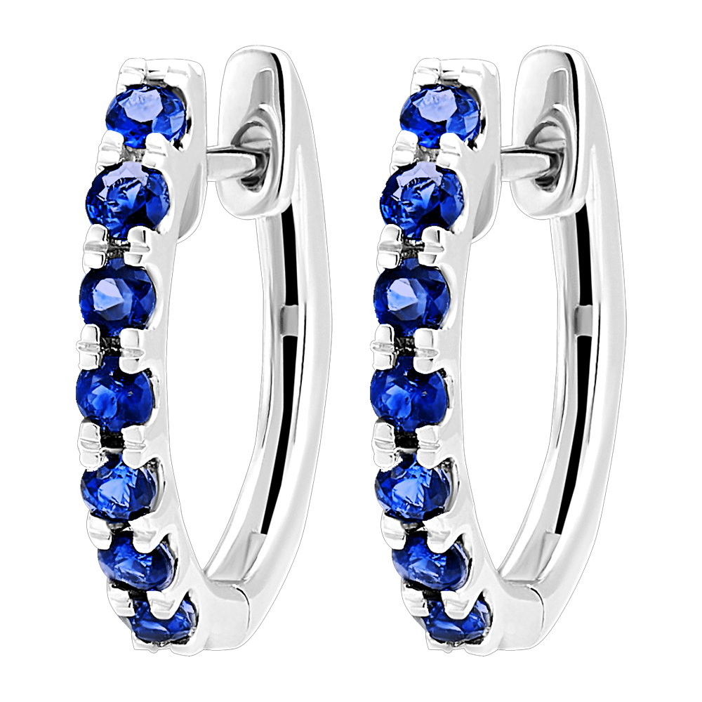 This delicate pair of 9K white gold hoop earrings is semi-paved with 14 blue sapphires of Very Good quality.