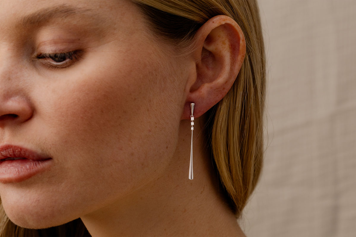 A pair of drop earrings in white gold with diamonds which gently sway .