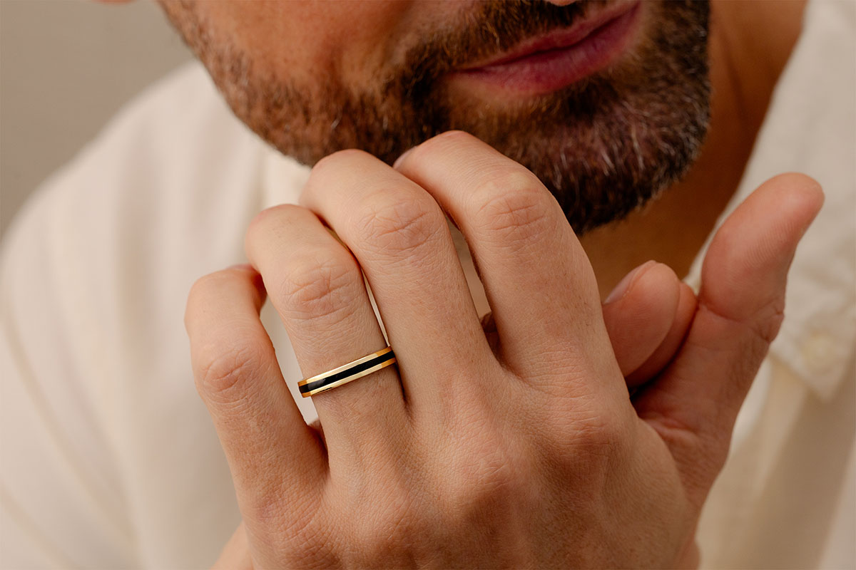 A rounded gold ring is crossed by two bands of black lacquer for a modern and masculine Wedding Ring Clair Obscure