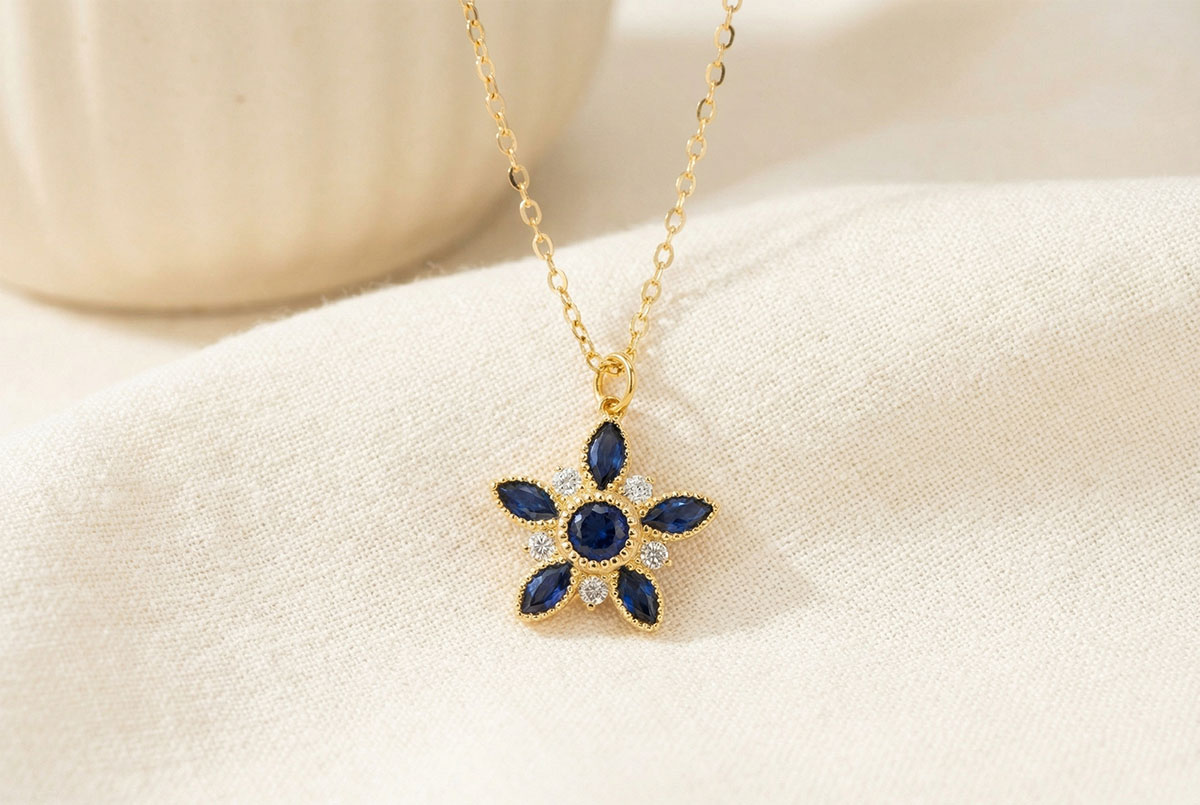 Six deep sapphires form a star-shaped blossom, accented by five sparkling diamonds.A celestial necklace shimmering with mystery and regal brilliance.